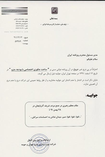 مدیریت ارتباطات و امور بین الملل شرکت بهره برداری مترو تهران و حومه در واکنش به انتشار خبری دروغ درباره این شرکت مبنی بر”ساخت جکوزی اختصاصی برای مدیران مترو”در شماره امروز روزنامه ایران در تاسی از رهنمود مهم رهبر فرزانه انقلاب مبنی بر ضرورت رعایت تقوا، به پاسخی با مضمون” تقوا، تقوا، تقوا، صبر، میدان ندادن به احساسات سرکش…” بسنده کرد.