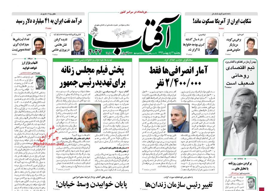 صفحه اول روزنامههای پنجشنبه ۴ اردیبهشت ۱۳۹۳