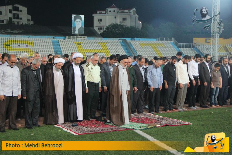 اما از نکات خاص و بیادماندنی مراسم دیشب برگزاری نماز جماعت مغرب وعشاء به امامت حجت الاسلام قوام بروی چمن مصنوعی ورزشگاه عضدی رشت بود که در این نماز مسولان و ورزشکاران گیلانی زیر بارش باران نماز جماعت خود را اقامه کردند