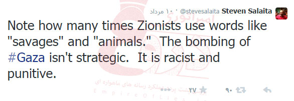 به گزارش پایگاه اطلاع رسانی دیارمیرزا ، «استیون سلایطه» (Steven Salaita) استادیار دانشگاه ایلینویز آمریکا، تنها به سبب حمایت از مردم مظلوم غزه و انتقاد از جنایات رژیم صهیونیستی در صفحه توئیترش، نامه لغو قراردادش با این دانشگاه را دریافت و اخراج شد.