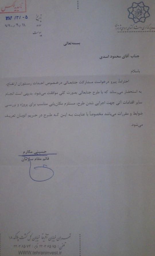 این ایده به قدری ناب و جذاب به نظر میرسد که در زمانی کوتاه، مسئولان شهرداری وی را فراخوانده و برای تکمیل طرح، ارزیابی و اجرا، به سازمان سرمایهگذاری و مشارکتهای مردمی شهرداری سوقش میدهند. از اینجا به بعد، فرایند به صورت جدیتر پیگیری شده و مدیران سازمان مشارکتهای مردمی از وی درخواست میکنند که پروژه «پل رستوران» را طراحی کرده و نقشههای فنی پروژه را در اختیارشان بگذارد که این موضوع اسدی را بر آن میدارد که با یکی از شرکتهای مطرح در عرصه طراحی سازههای شهری تماس گرفته و طی قراردادی، طراحی پروژه را به ایشان واگذار نماید.