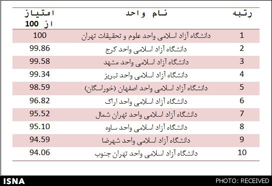 دهقانی گفت: دانشگاه آزاد اسلامی واحد علوم و تحقیقات تهران که یکی از بزرگترین واحد دانشگاهی در بین دانشگاههای آزاد اسلامی کشوراست، در جایگاه نخست فهرست سال ۹۳-۱۳۹۲ قرار گرفته است. دانشگاه آزاد اسلامی واحد کرج نیز توانست با پیشی گرفتن از دانشگاه آزاد واحد مشهد، رتبه دو را کسب کند. دانشگاه آزاد اسلامی واحد مشهد که در رتبهبندی ISC سال ۹۱-۱۳۹۰ حائز رتبه دوم در بین دانشگاههای آزاد کشور شده بود، در سال ۹۳-۱۳۹۲ رتبه سوم جدول را به خود اختصاص داد. همچنین واحدهای تبریز، خوراسگان اصفهان، اراک، تهران شمال، ساوه، شهرضا و تهران جنوب نیز به ترتیب در جایگاههای ۴ تا ۱۰ جدول قرار گرفتهاند.