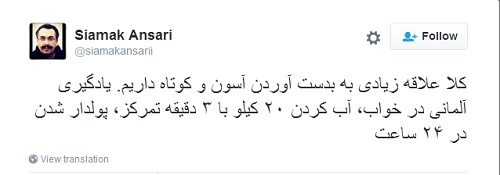 انصاری که یکی از بازیگران برنامه «دورهمی» است در توئیتر نوشت : «کلا علاقه زیادی به بدست آوردن آسون و کوتاه داریم. یادگیری آلمانی در خواب، آب کردن ۲۰ کیلو با ۳ دقیقه تمرکز، پولدار شدن در ۲۴ ساعت.»