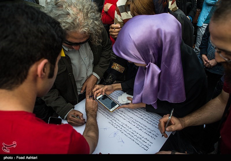 معصومه مظفری – رئیس انجمن هنرمندان نقاش – نیز در این تجمع، نامه سرگشادهای را که توسط انجمن هنرمندان سفالگر، مهندسان شهرساز، تصویرگران و انجمن علمی نقاشی دانشگاه هنر خطاب به وزیر فرهنگ و ارشاد اسلامی نوشته شده بود، برای حاضران خواند.