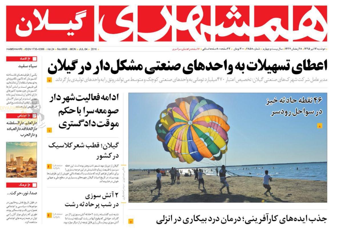 صفحه اول روزنامه همشهری گیلان دوشنبه ۱۴ تیر