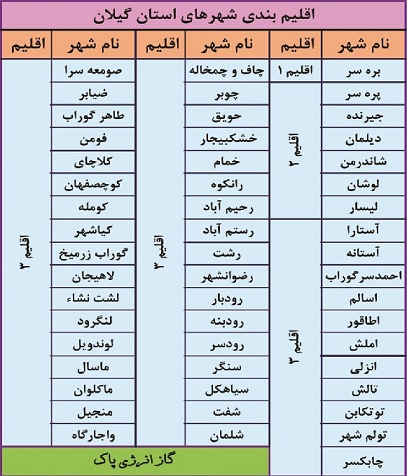 استان گیلان به لحاظ اقلیم بندی به سه اقلیم، اقلیم ۱ ( بره سر) ، اقلیم ۲ (پره سر، شاندرمن، لوشان، لیسار جیرنده و دیلمان) و اقلیم ۳ ( رشت، شفت، فومن، انزلی، رودبار، رودسر، آستانه، رضوانشهر، صومعه سرا، لنگرود، لاهیجان، آستارا، سیاهکل، ماسال، املش و تالش) تقسیم می شود که این اقلیم بندی توسط شرکت ملی گاز ایران با همکاری سازمان هواشناسی تنظیم می شود و در اختیار شرکت های گاز استانی نمی باشد.