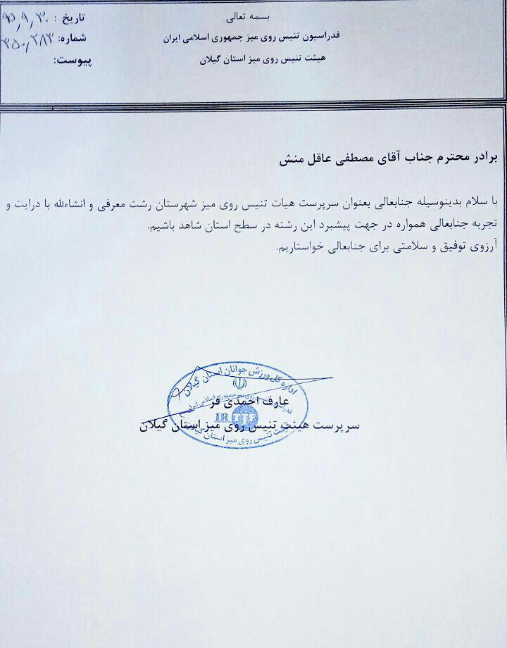 مصطفی عاقل منش سرپرست هیئت تنیس روی میز شهرستان رشت شد