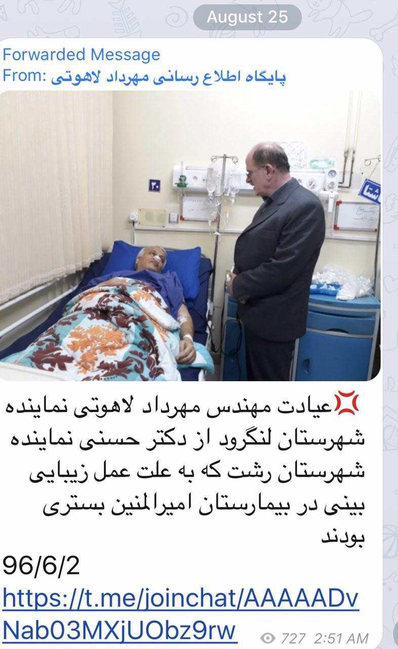 مهرداد لاهوتی نماینده مردم لنگرود در مجلس شورای اسلامی با انتشار تصویری در کانال تلگرامیاش به عیادت خود از نماینده مردم رشت در مجلس اشاره کرد.
