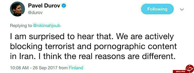 “از شنیدنش (خبر اعلام جرم) شگفت زده شدم . ما به صورت فعال محتوای تروریستی و پورنوگرافی را در ایران مسدود میکنیم. فکر میکنم دلایل اصلی این تصمیم چیز دیگری است ”