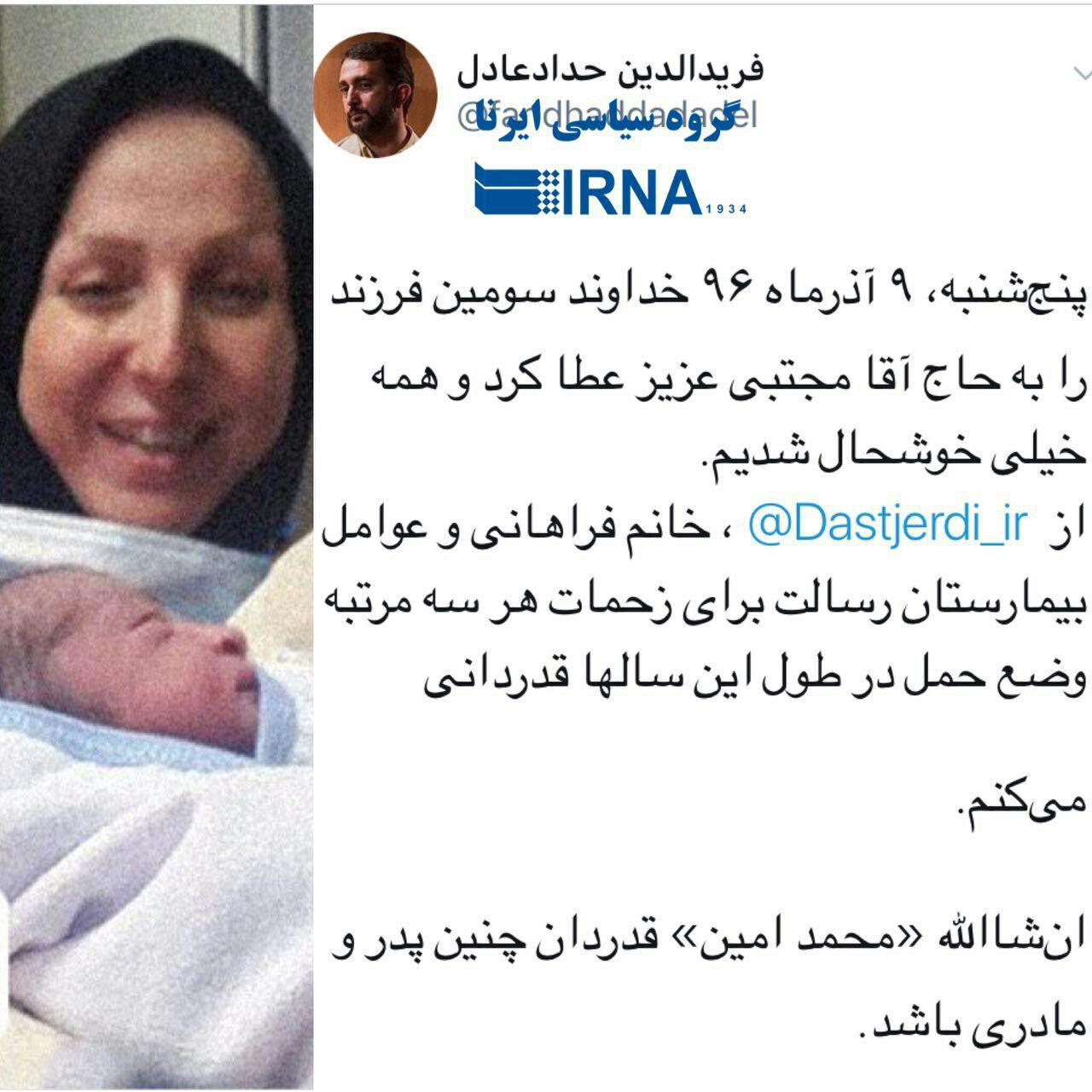 به گزارش پایگاه اطلاع رسانی دیارمیرزا فریدالدین حدادعادل، خبر تولد خواهرزادهی خود و نوه جدید مقام معظم رهبری را اعلام کرد: محمدامین حسینی خامنهای فرزند حجتالاسلام مجتبی خامنهای به دنیا آمد.