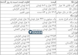 همچنین هر گرم طلای ۱۸ عیار ۱۳۳ هزار و ۸۰۹ تومان، هر مثقال طلا ۵۸۰ هزار تومان و هر اونس طلا در بازار جهانی ۱۳۰۲ دلار و ۸۴ سنت داد و ستد میشود.
