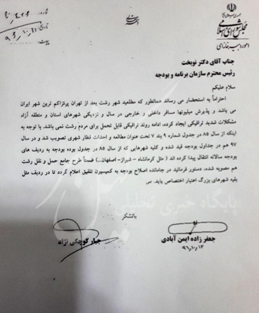 احتراما به استحضار میرساند همانطور که مطلعید شهر رشت بعد از تهران پرتراکم ترین شهر ایران می باشد و پذیرش میلیونها مسافر داخلی و خارجی در سال و نزدیکی شهرهای استان و منطقه آزاد مشکلات شدید ترافیکی ایجاد کرده،ادامه روند ترافیکی قابل تحمل برای مردم رشت نمی باشد.با توجه به اینکه از سال ۸۵ در جدول شماره ۹ بند ۷ تحت عنوان مطالعه و احداث قطار شهری تصویب شد و در سال ۹۷ هم در جدول بودجه قید شده و کلیه شهرهایی که از سال ۸۵ در جدول برنامه و بودجه به ردیف های بودجه سالانه انتقال پیدا کرده اند (مثل کرمانشاه-شیراز-اصفهان و…) ضمنا طرح جامع حمل و نقل رشت هم مصوبه شده، دستور فرمایید در جامانده اصلاح بودجه به کمیسیون تلفیق اعلام گردد تا در ردیف مثل بقیه شهرهای بزرگ اعتبار اختصاص یابد.