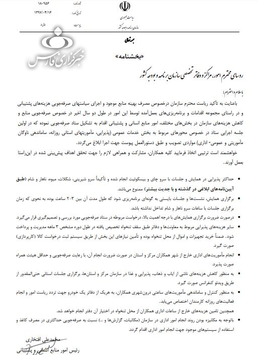 رئیس امور منابع انسانی و پشتیبانی سازمان برنامه و بودجه کشور طی دستورالعملی نحوه صرفه جویی در هزینهها را به تمامی روسای استانی ابلاغ کرد.