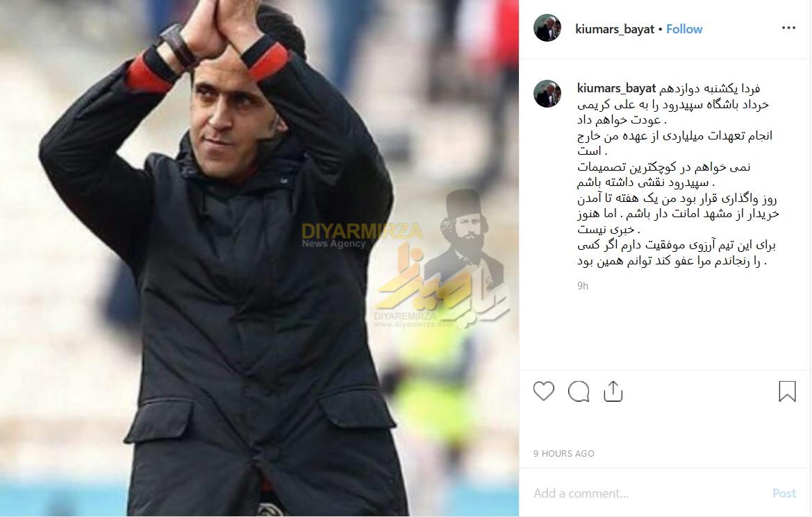 اختصاصی پایگاه اطلاع رسانی دیارمیرزا، کیومرث بیات، مالک موقت سپیدرود رشت با انتشار پستی در صفحه شخصی خود در اینستاگرام از عودت تیم سپیدرود به علی کریمی خبر داد.