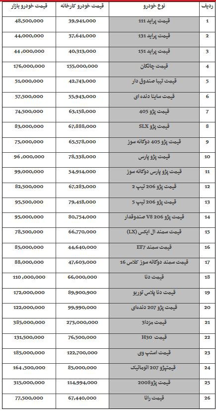 همچنین پراید ۱۱۱ با قیمت ۴۸ میلیون و ۵۰۰ هزار تومان، پراید ۱۳۱ با قیمت ۴۴ میلیون تومان، پژو ۴۰۵ با قیمت ۷۴ میلیون و ۵۰۰ هزار تومان، پژو ۲۰۶ تیپ ۲ با قیمت ۸۲ میلیون و ۵۰۰ هزار تومان و پژو۲۰۶ صندوق دار با قیمت ۹۵ میلیون تومان به فروش میرسد.