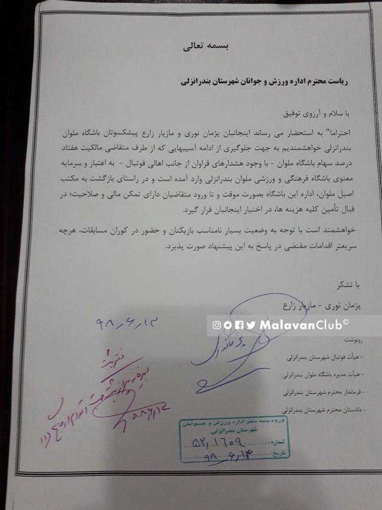 همچنین رونوشت این درخواست در اختیار دادستان و فرماندار شهرستان و همچنین ریاست هیات فوتبال انزلی قرار گرفت.
