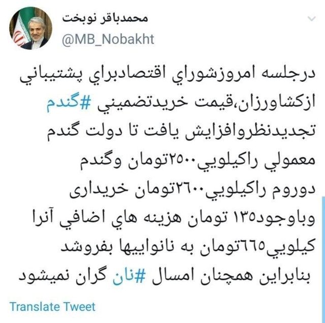 در جلسه امروز شورای اقتصاد،برای پشتیبانی از کشاورزان،قیمت خرید تضمینی گندم تجدیدنظر و افزایش یافت تا دولت گندم معمولی را کیلویی ۲۵۰۰ تومان و گندم دوروم را کیلویی ۲۶۰۰ تومان خریداری و با وجوه ۱۳۵ تومان هزینههای اضافی آن را کیلویی ۶۶۵ تومان به نانواییها بفروشد بنابراین همچنان امسال نان گران نمیشود.