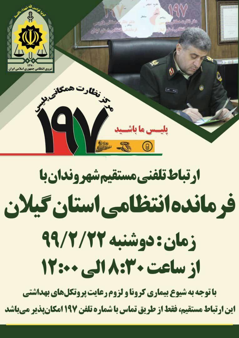 از ساعت ۹ تا ۱۱ فردا دوشنبه ۲۲ اردیبهشت، سردار عزیزالله ملکی فرمانده انتظامی گیلان با حضور در دفتر نظارت همگانی نیروی انتظامی از طریق سامانه تلفنی ۱۹۷، پاسخگوی مشکلات مردم در حوزه انتظامی خواهد بود.