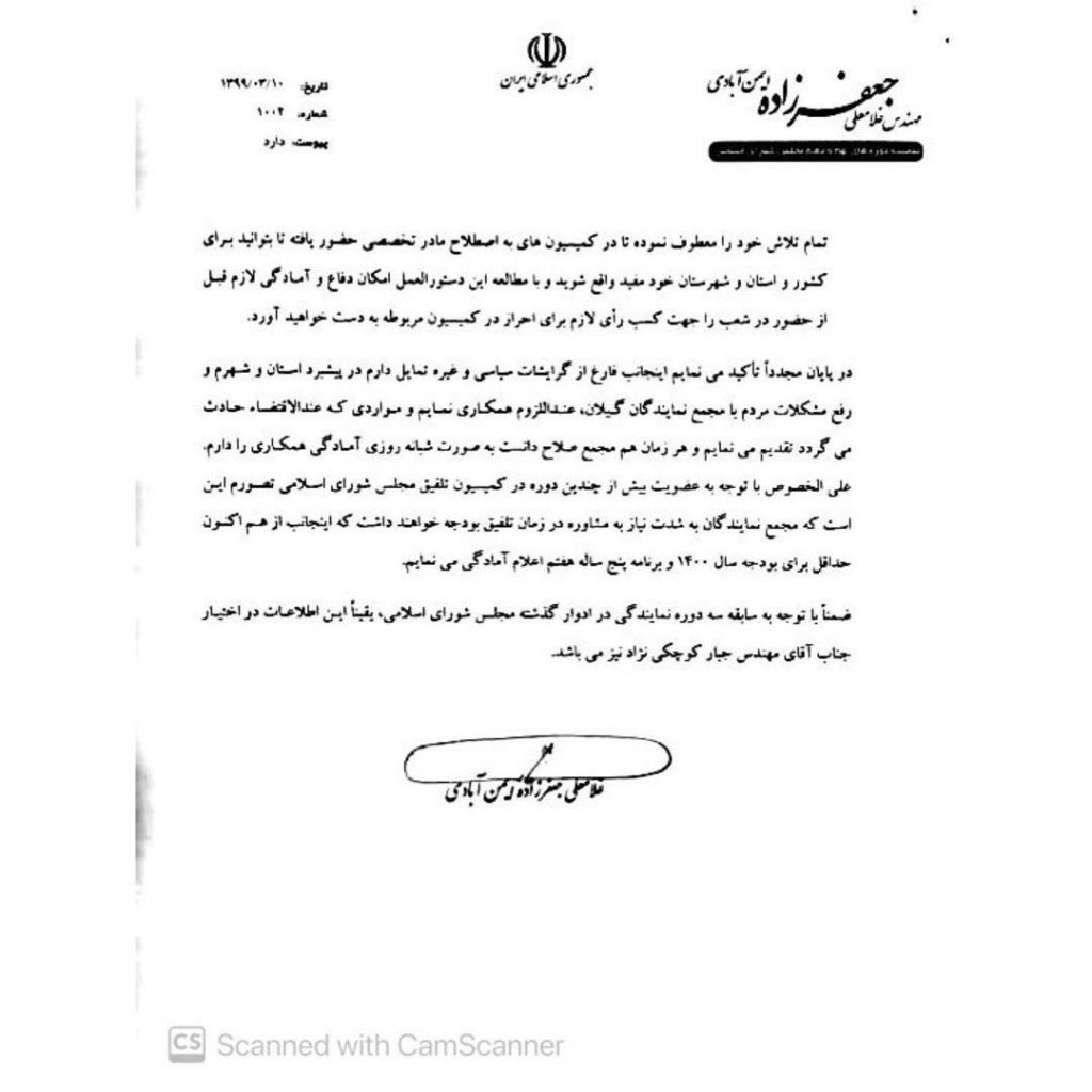 نمایده ادوار رشت در مجلس شورای اسلامی همچنین آمادگى خود را براى کمک در اصلاح و تصویب بودجه سال ۱۴۰۰ و برنامه پنج ساله هفتم با محوریت توسعه استان گیلان را اعلام کرد.