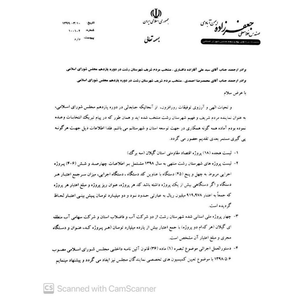 نمایده ادوار رشت در مجلس شورای اسلامی همچنین آمادگى خود را براى کمک در اصلاح و تصویب بودجه سال ۱۴۰۰ و برنامه پنج ساله هفتم با محوریت توسعه استان گیلان را اعلام کرد.