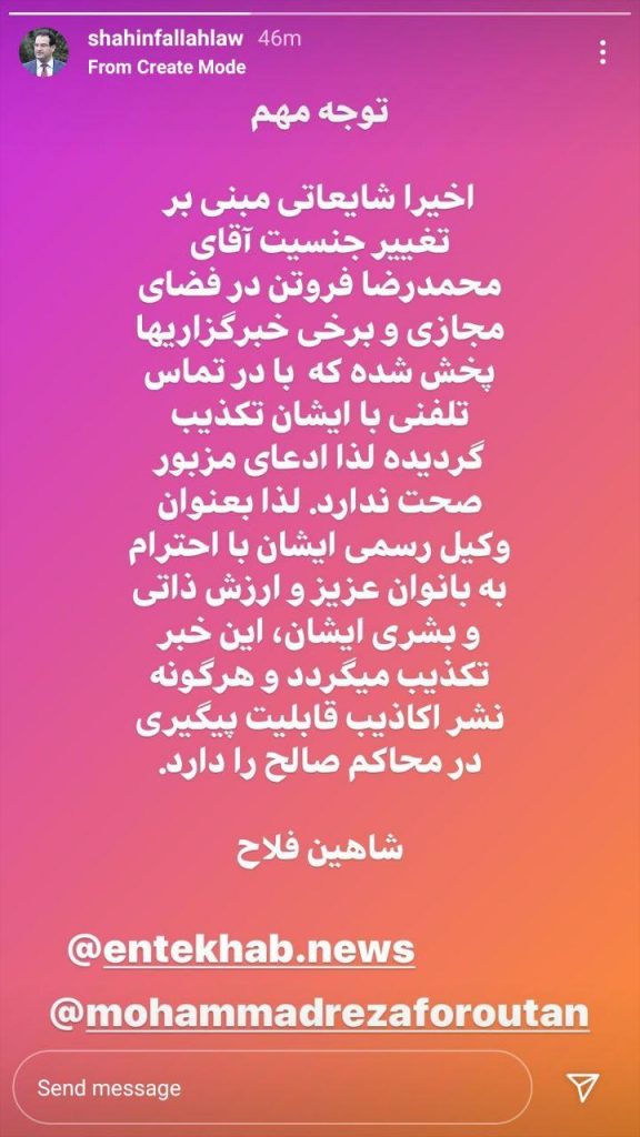 شاهین فلاح وکیل محمد رضا فروتن در استوری صفحه شخصی خود در اینستاگرام تغییر جنسیت وی را رد کرد.