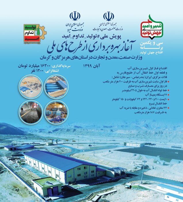 به گزارش پایگاه اطلاع رسانی دیارمیرزا به نقل از ایرنا، آیین افتتاح مرحله اول شیرینسازی آب و قطعه اول خط انتقال آب از خلیجفارس فلات مرکزی ایران (بندرعباس – سیرجان) از طرحهای ملی وزارت نیرو و وزارت صنعت، معدن و تجارت در استانهای هرمزگان و کرمان با سرمایهگذاری ۱۶ هزار و ۳۰۰ میلیارد تومان، صبح پنجشنبه – پانزدهم آبانماه- با ارتباط تصویری حجتالاسلاموالمسلمین حسن روحانی رییسجمهوری آغاز شد.