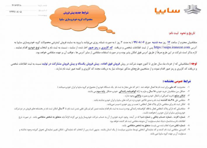 به گزارش پایگاه اطلاع رسانی دیارمیرزا، شرکت خودروسازی سایپا در طرح پیش فروش مشارکت در تولید ویژه آبان ماه، ۹ محصول خود را عرضه کرده است که ثبت نام در این طرح از ساعت ۱۴ روز سه شنبه ۶ آبان به صورت اینترنتی امکان پذیر است و پس از اتمام فرایند ثبت نام متقاضیان، واجدین شرایط به مرحله قطعه کشی خواهند رفت.