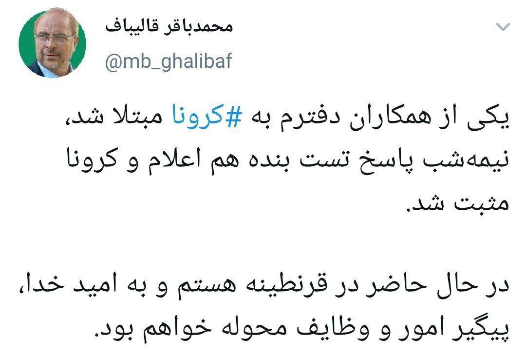 محمدباقر قالیباف به کرونا مبتلا شد و به قرنطینه رفت!