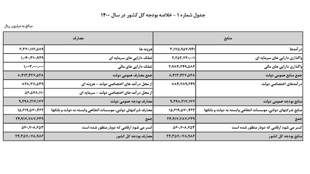 این در حالی است که دولت در بخش منابع ۸۴۱ هزار میلیارد تومان منابع عمومی و در مجموع ۹۲۹ هزار میلیارد تومان بودجه عمومی پیش بینی کرده است.