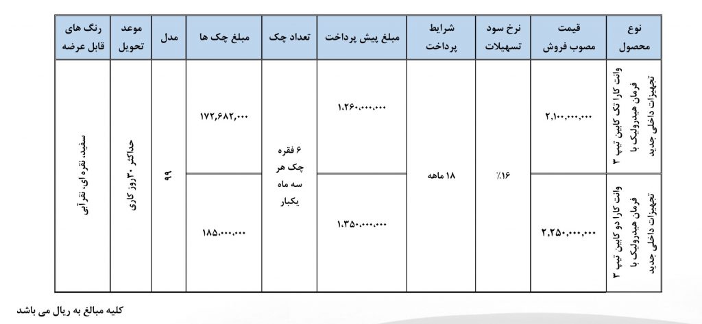تحویل خودروهای این شرایط فروش هم ۳۰ روزه اعلام شده و در طرح اقساطی نیز ۶۰ درصد قیمت خودرو به صورت پیش پرداخت و الباقی در قالب اقساط ۱۸ ماهه و سود ۱۶ درصد قابل پرداخت است.
