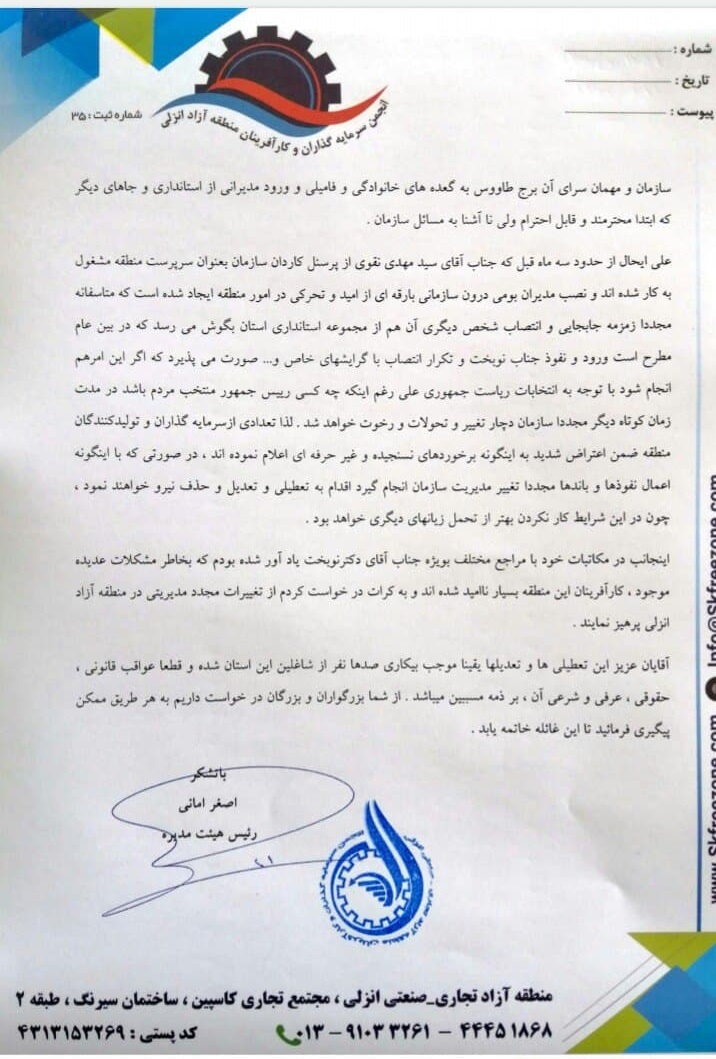اینجانب در مکاتبات خود در مراجع مختلف به ویژه جناب آقای دکتر نوبخت یادآور شده بودم که بخاطر مشکلات عدیده موجود کارآفرینان این منطقه بسیار ناامید شدند و به کرات درخواست کردند از تغییرات مجدد مدیریتی در منطقه آزاد انزلی پرهیز نمایند.