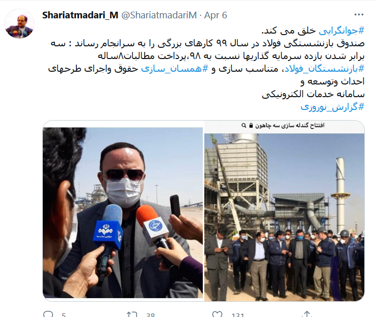 به گزارش پایگاه اطلاع رسانی دیارمیرزا، محمد شریعتمداری در حساب شخصی خود در فضای مجازی با قدردانی از عملکرد رضا مسرور در صندوق بازنشستگی فولاد نوشت: جوانگرایی خلق میکند. صندوق بازنشستگی فولاد در سال ۹۹ کارهای بزرگی را به سرانجام رساند: سه برابر شدن بازده سرمایه گذاریها نسبت به ۹۸، پرداخت مطالبات ۸ ساله بازنشستگان فولاد، متناسب سازی و همسان سازی حقوق و اجرای طرحهای احداث و توسعه و سامانه خدمات الکترونیکی.