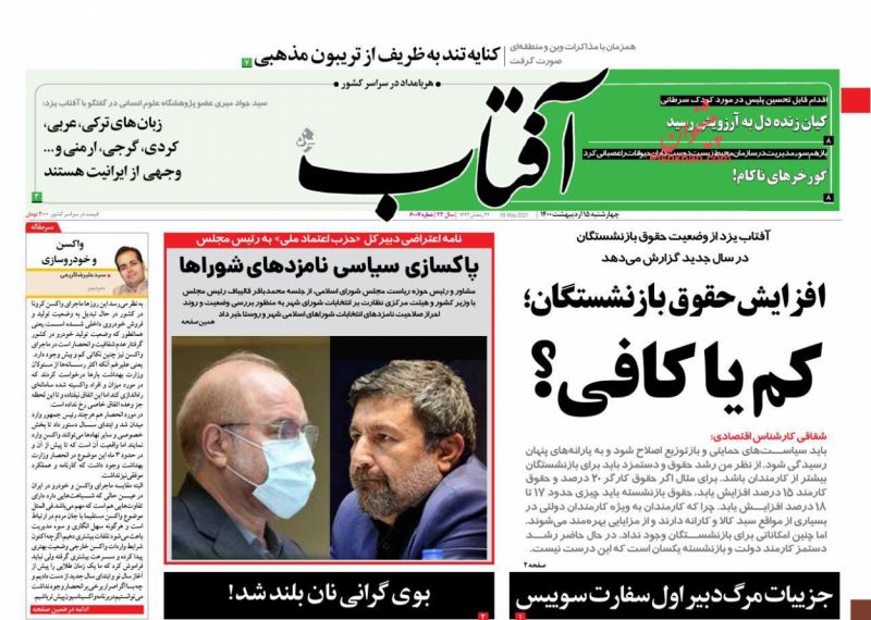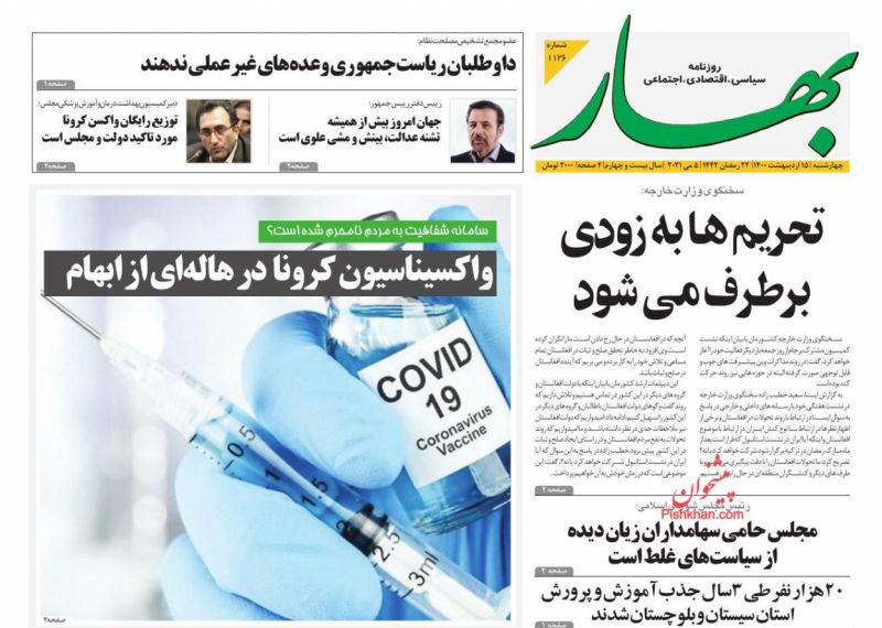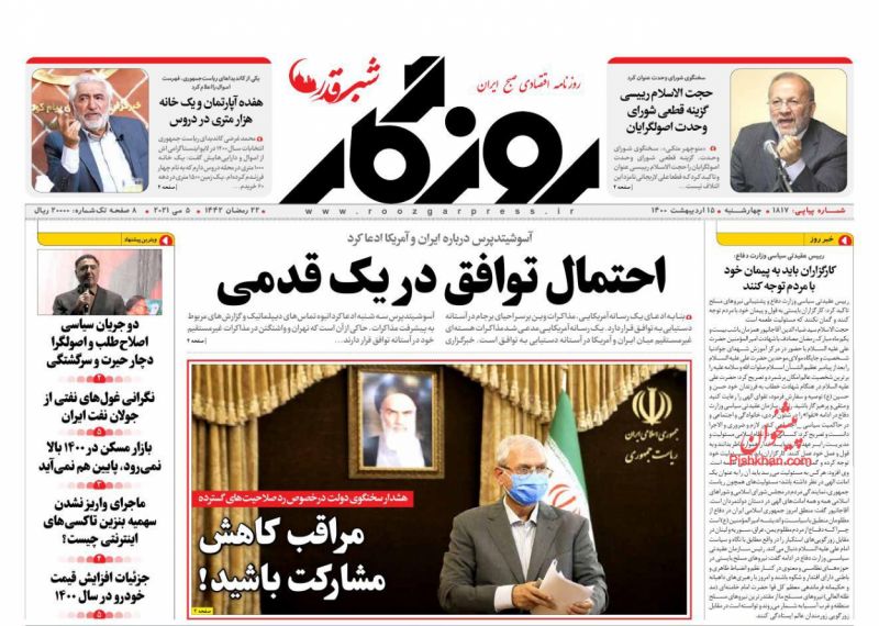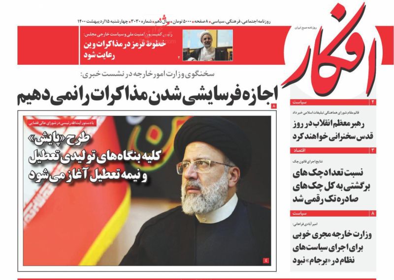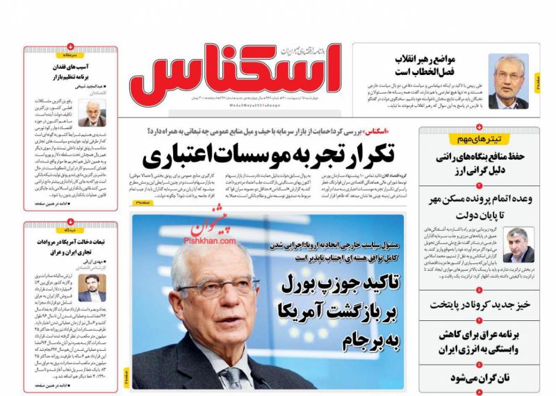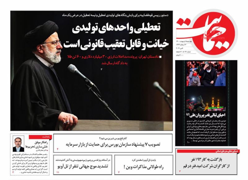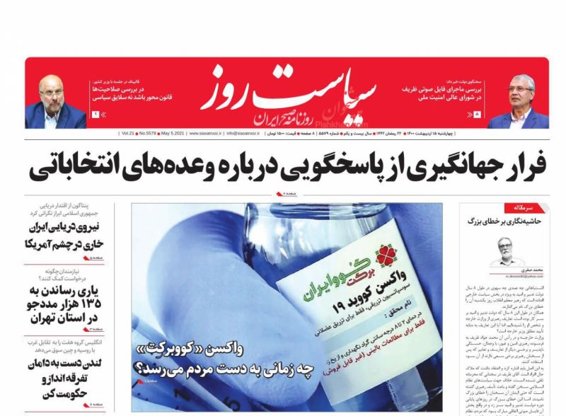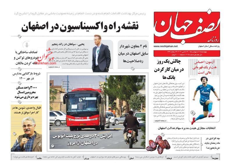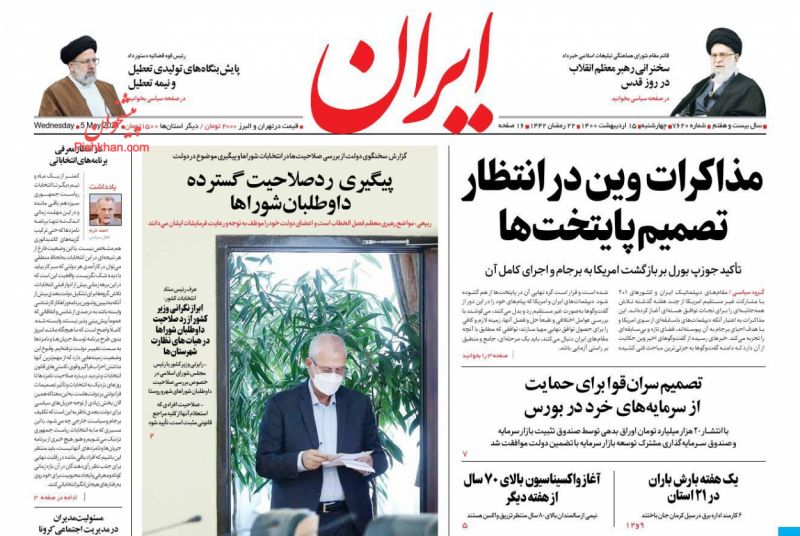 صفحه اول روزنامههای چهارشنبه ۱۵ اردیبهشت ۱۴۰۰