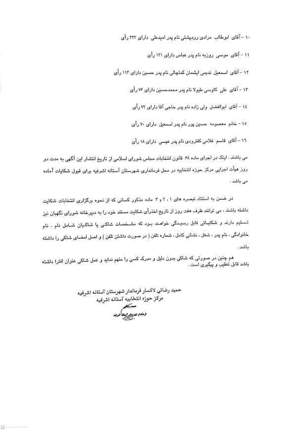 ابراهیم نجفی با کسب ۱۲ هزار و ۷۰۹ رای و ۲۴/۲۲ درصد آرا به عنوان منتخب مردم شهرستان آستانه اشرفیه در مجلس یازدهم برگزیده شد.