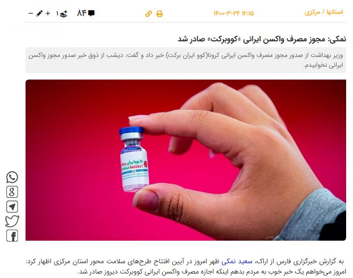 اعلام خبر مجوز واکسن برکت در ۲۴ خرداد