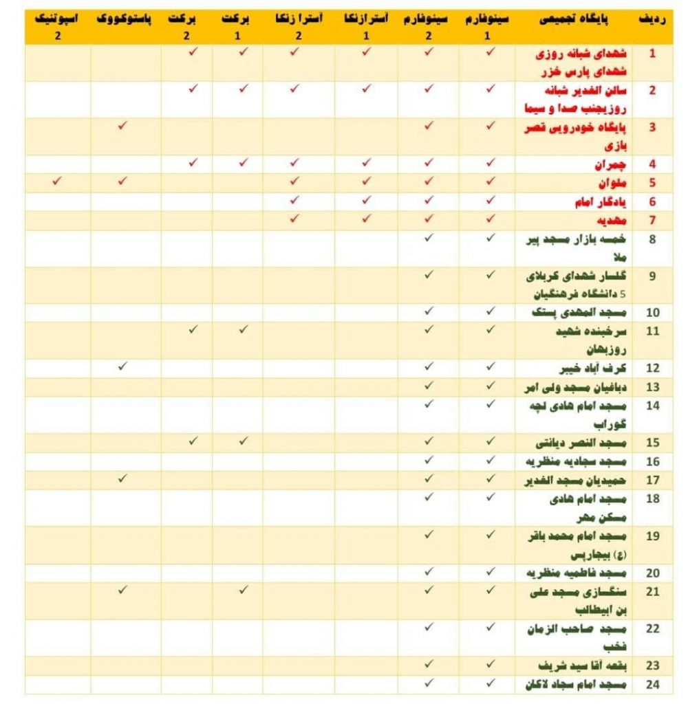 در این مراکز تزریق واکسن سینوفارم ۱ و ۲، برکت ۱ و ۲، آسترازنکا ۱ و ۲، پاستوکووک و اسپوتنیک صورت میگیرد.