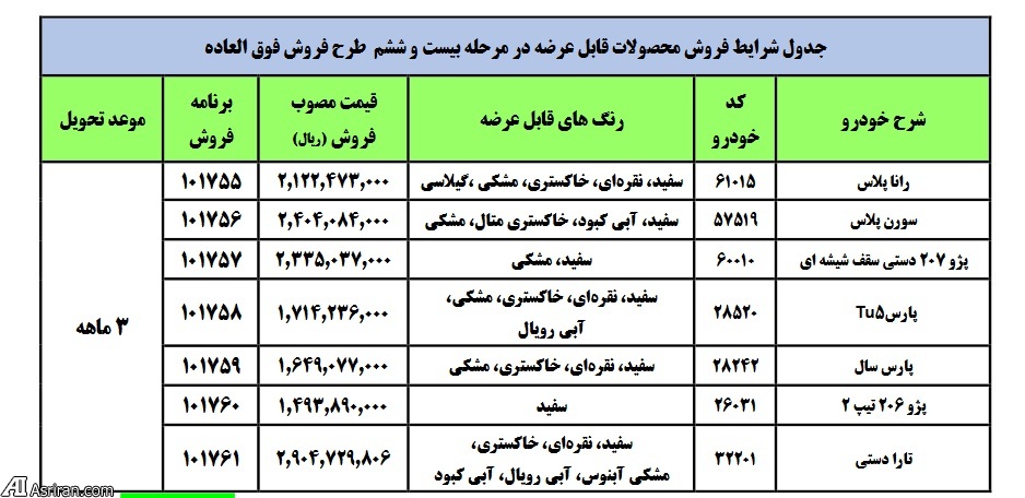 به گزارش عصر ایران در این طرح فروش ۷ محصول رانا پلاس، سورن پلاس، پژو ۲۰۷ دستی سقف شیشه ای، پارس پلاس TU۵، پارس سال، پژو ۲۰۶ تیپ ۲ و تارای دستی از طریق قرعه کشی عرضه می شود.
