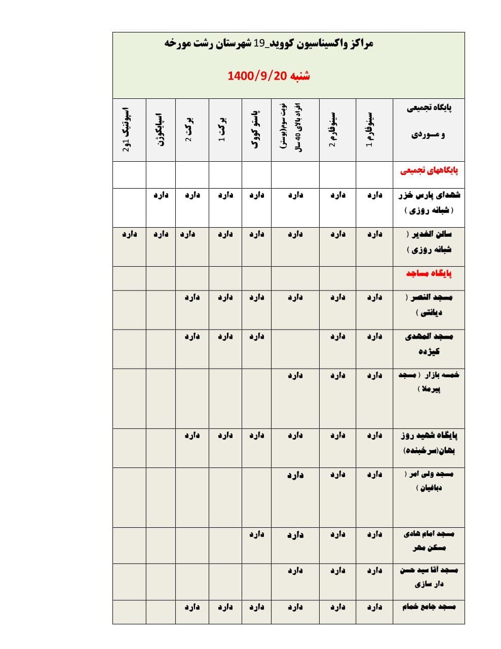 مراکز واکسیناسیون در شهرستان رشت و خمام (شنبه ۲۰ آذر) آماده تزریق واکسن به عموم مردم هستند.در این مراکز تزریق واکسن اسپایکوژن، سینوفارم ۱ و ۲، برکت ۱ و ۲ و پاستوکووک و در یک مرکز اسپوتنیک، صورت میگیرد.