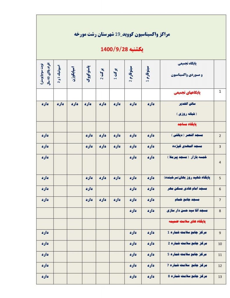 لیست مراکز واکسیناسیون کرونا در رشت و خمام (یکشنبه ۲۸ آذر)