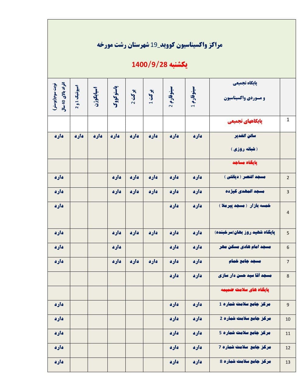 در این مراکز تزریق واکسن اسپایکوژن، سینوفارم ۱ و ۲، برکت ۱ و ۲ و پاستوکووک و در یک مرکز اسپوتنیک، صورت میگیرد.