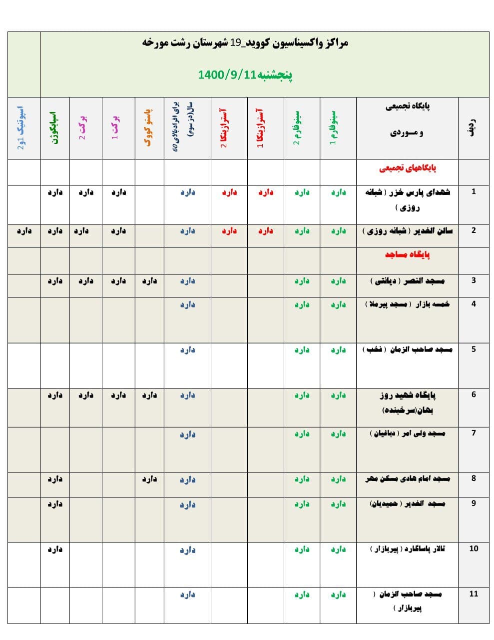 در این مراکز تزریق واکسن اسپایکوژن، سینوفارم ۱ و ۲، برکت ۱ و ۲، آسترازنکا ۱ و ۲ و پاستوکووک و در یک مرکز اسپوتتنیک، صورت میگیرد.