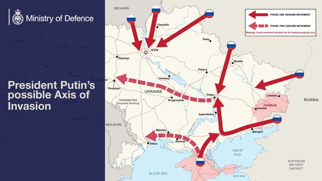 در گزارش وزارت دفاع انگلیس آمده است: پوتین نیروهایش را به نحوی در مرز مستقر کرده است که مستقیما کییف (پایتخت اوکراین) را هدف قرار میدهد. این گزارش همچنین به طرح چند مسیر احتمالی سربازان روسیه در هنگام حمله پرداخت که در آن، بخش اعظم شرق اوکراین به تصرف در میآید.