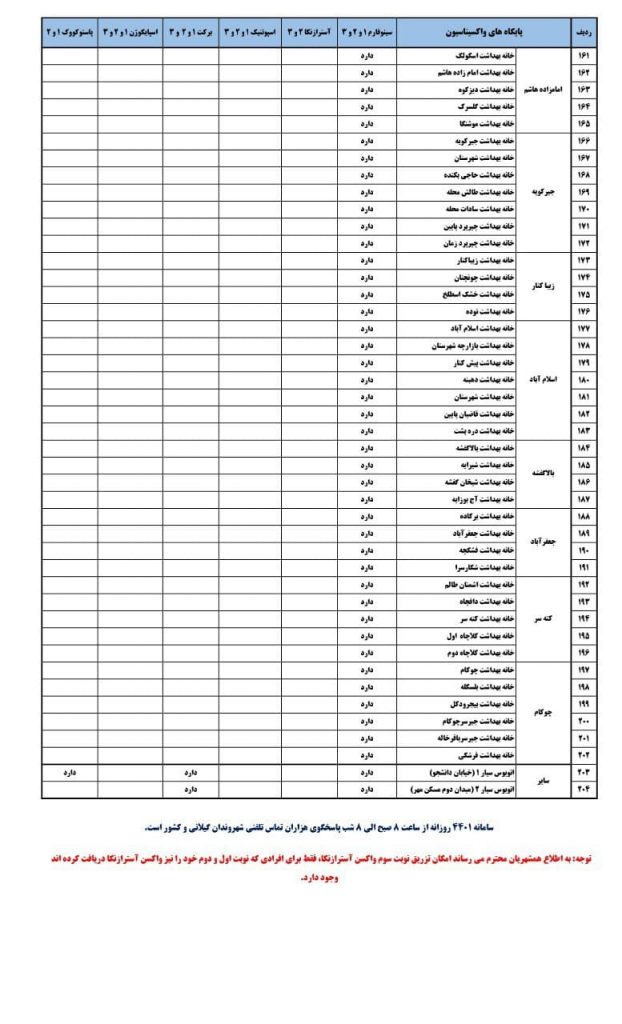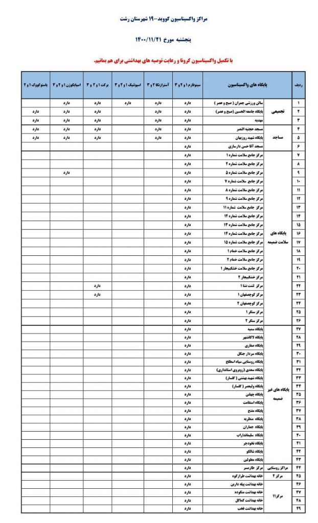 ۲۰۴ مراکز واکسیناسیون کرونا در رشت (پنجشنبه ۲۱ بهمن) آماده تزریق واکسن به عموم مردم هستند.در این مراکز تزریق واکسن سینوفارم ۱، ۲ و ۳، برکت ۱، ۲ و ۳، پاستوکووک ۱ و ۲، آسترازنکا ۲ و ۳، اسپایکوژن ۱، ۲ و ۳ و اسپوتنیک ۱ و ۲ صورت میگیرد.