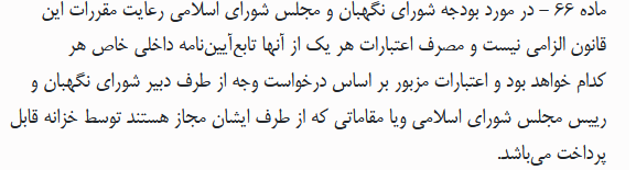 در ماده ۶۶ قانون محاسبات عمومی کشور مصوب سال ۱۳۶۶، شورای نگهبان و مجلس از مقررات بودجهای مستثنا شده بودند.