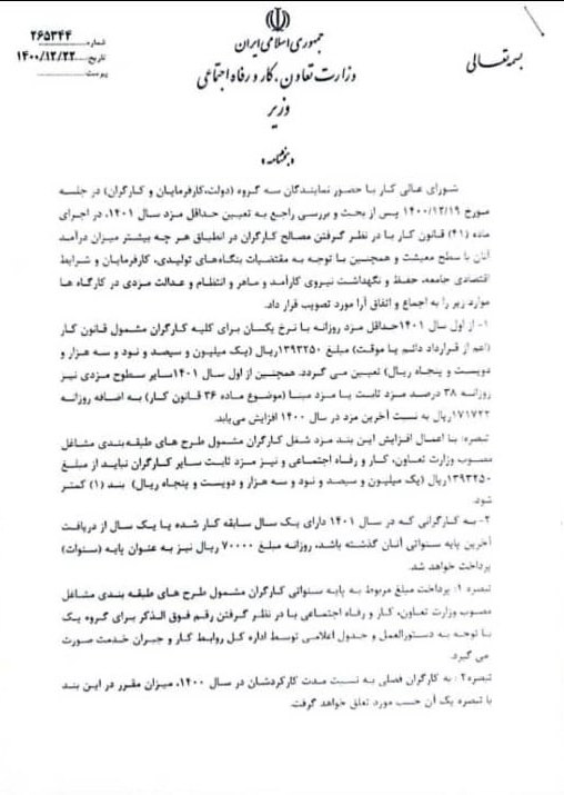 حجت الله عبدالملکی وزیر تعاون، کار و رفاه اجتماعی بخشنامه دستمزد کارگران در سال ۱۴۰۱ که ۱۹ اسفند ماه در شورای عالی کار به تصویب رسید را ابلاغ کرد.