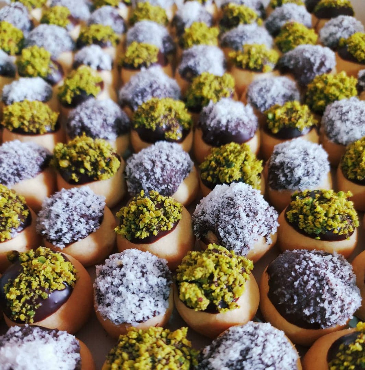 شیرینی بعدی را بعد از اینکه داخل شکلات زدید، با پودر نارگیل تزیین کنید و همه شیرینیها را به همین ترتیب یکی درمیان با پودر پسته و پودر نارگیل تزیین کنید. توجه داشته باشید که باید در این کار سرعت عمل داشته باشید تا شکلات سرد و سفت نشود. اگر شکلات سرد شد، دوباره آن را روی بخار آب جوش بگذارید تا گرم و روان شود.