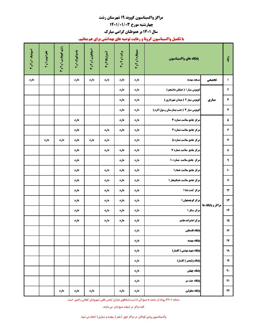 لیست مراکز واکسیناسیون کرونا در رشت (چهارشنبه ۳ فروردین)