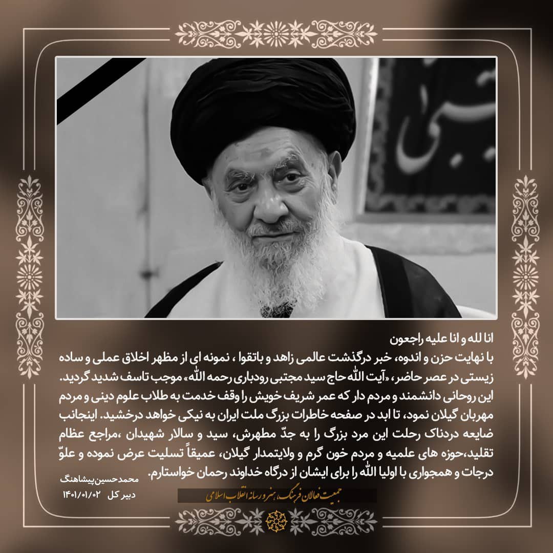 اینجانب این مصیبت را به محضر حضرت ولیعصر (عج)، رهبر معظم انقلاب، مراجع عظام تقلید، علمای اعلام، حوزههای علمیه سراسر کشور به ویژه بیت مکرم آن فقید سعید و مردم شریف استان گیلان تسلیت عرض مینمایم.