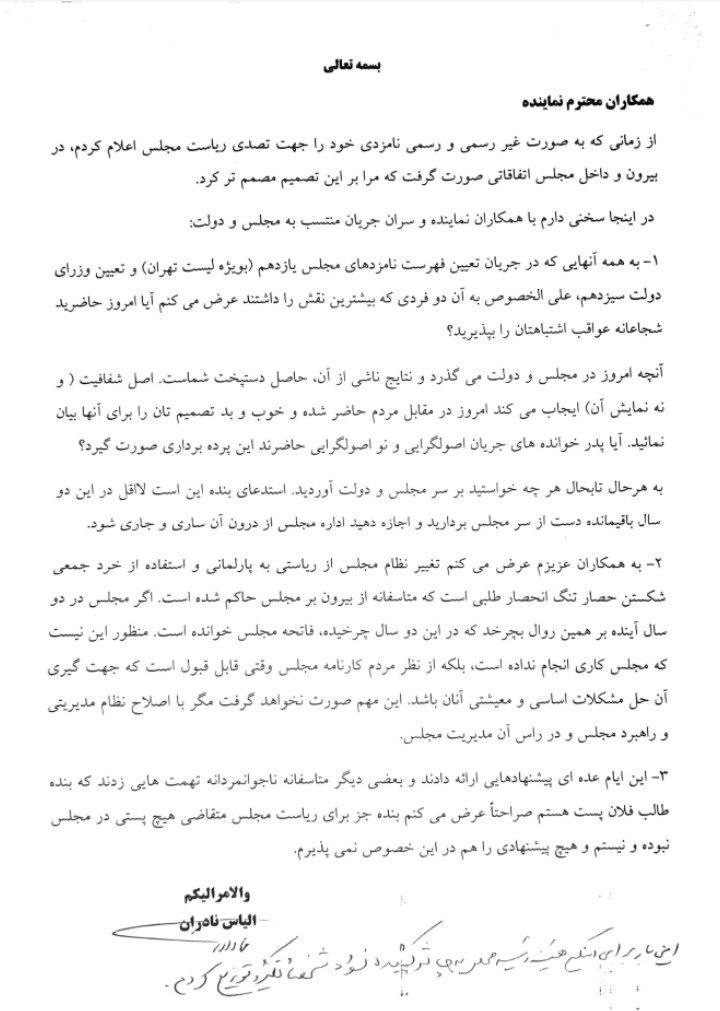 به گزارش پایگاه اطلاع رسانی دیارمیرزا، الیاس نادران در نامهای ضمن انتقاد تند از عملکرد دولت و مجلس نوشته: