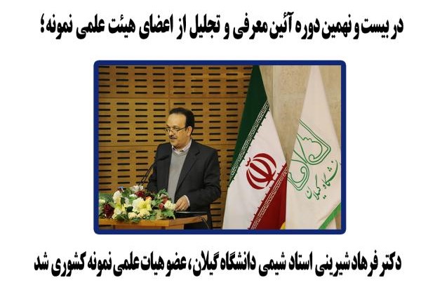 در بیست و نهمین دوره آئین معرفی و تجلیل از اعضای هیئت علمی و دانشجویان نمونه کشوری، دکتر فرهاد شیرینی، استاد شیمی دانشگاه گیلان به عنوان عضو هیات علمی نمونه کشوری تقدیر به عمل آمد.